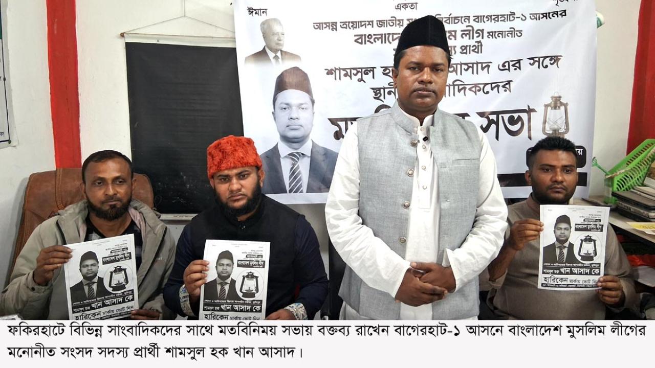 ত্রয়োদশ জাতীয় সংসদ নির্বাচনে বাগেরহাট-১ (ফকিরহাট-মোল্লাহাট-চিতলমারী) আসনের বাংলাদেশ মুসলিম লীগের প্রার্থী শামসুল হক খান আসাদ শনিবার (৩১ জানুয়ারি) ফকিরহাটে স্থানীয় সাংবাদিকদের সাথে মতবিনিময় সভা করেছেন। সভা ফকিরহাট বিশ্বরোড সংলগ্ন একটি অফিসে অনুষ্ঠিত হয়।