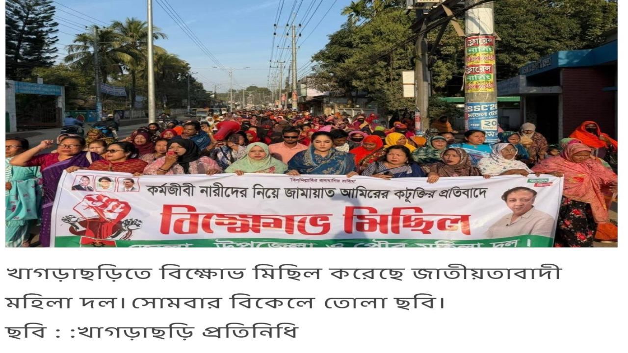 কর্মজীবী নারীদের নিয়ে জামায়াতের আমিরের কটুক্তিমূলক বক্তব্যের প্রতিবাদে খাগড়াছড়িতে বিক্ষোভ মিছিল ও সমাবেশ অনুষ্ঠিত হয়েছে।