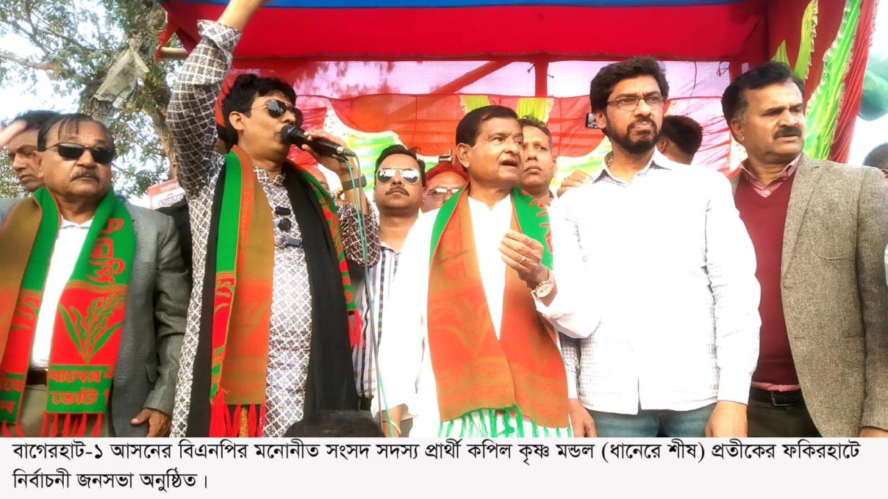 বাগেরহাট-১ (ফকিরহাট-মোল্লাহাট-চিতলমারী) আসনের বিএনপি মনোনীত সংসদ সদস্য প্রার্থী কপিল কৃষ্ণ মন্ডলের (ধানের শীষ) নির্বাচনী জনসভা সোমবার (৯ ফেব্রুয়ারি) বিকেল ৫টায় ফকিরহাট কাজী আজহার আলী কলেজ সংলগ্ন মাঠে অনুষ্ঠিত হয়। জনসভায় হাজারো নেতা-কর্মী ও সমর্থক অংশগ্রহণ করেন।