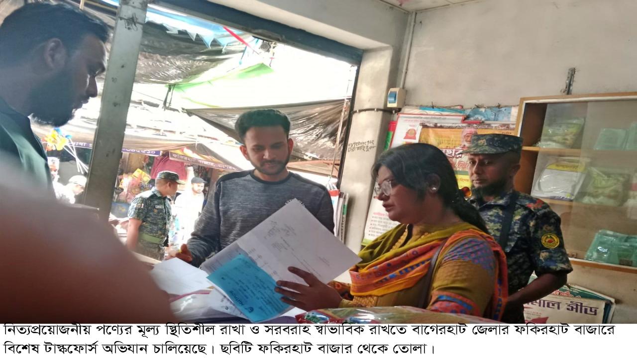 নিত্যপ্রয়োজনীয় পণ্যের মূল্য স্থিতিশীল রাখা ও সরবরাহ স্বাভাবিক রাখতে বাগেরহাট জেলার ফকিরহাট উপজেলা বাজারে বিশেষ টাস্কফোর্স অভিযান পরিচালিত হয়েছে। বৃহস্পতিবার (১৯ ফেব্রুয়ারি) দুপুরে এ অভিযানে বিভিন্ন অনিয়মের অভিযোগে তিনটি প্রতিষ্ঠানকে মোট ৬ হাজার ৫০০ টাকা জরিমানা করা হয়।