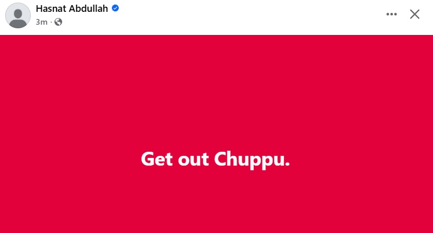 বৃহস্পতিবার (১২ মার্চ) বিকেল প্রায় ৪টার দিকে তিনি তার ব্যক্তিগত ফেসবুক অ্যাকাউন্টে ইংরেজিতে সংক্ষিপ্ত একটি স্ট্যাটাস দেন। সেখানে মাত্র তিনটি শব্দ লেখা ছিল—“Get out Chuppu”। পোস্টটি প্রকাশের পরপরই তা সামাজিক যোগাযোগমাধ্যমে দ্রুত ছড়িয়ে পড়ে এবং ব্যাপক আলোচনা-সমালোচনার জন্ম দেয়।