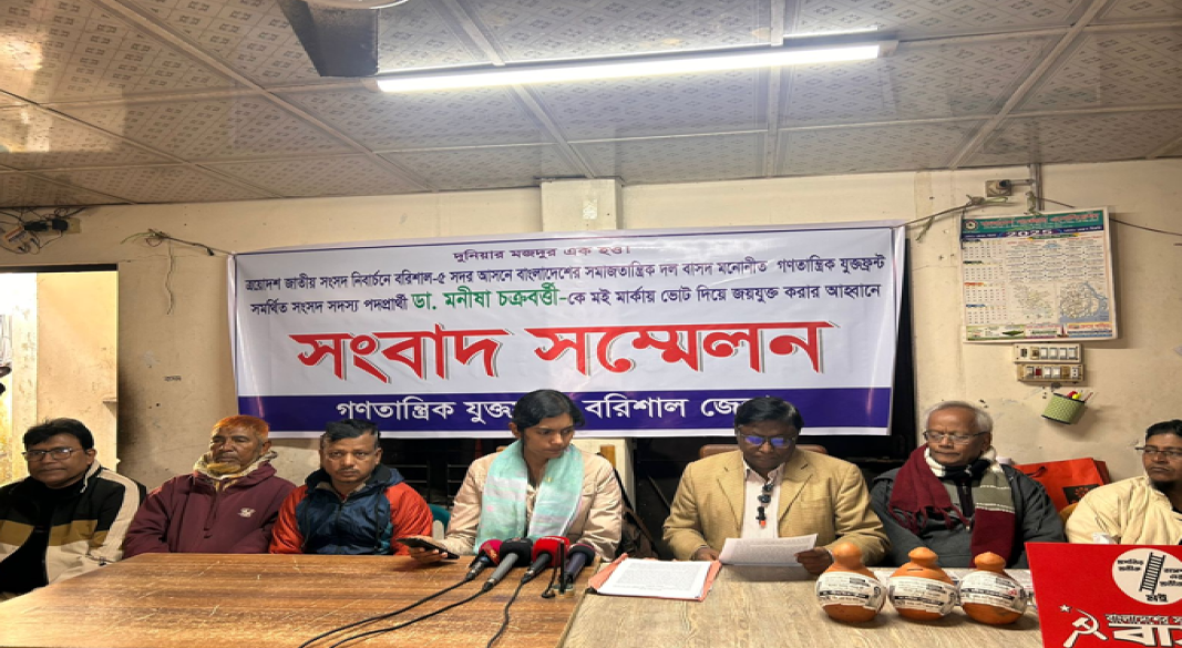বরিশাল জেলা কার্যালয়ে সোমবার (৫ জানুয়ারি) সকাল ১১টায় গণতান্ত্রিক যুক্ত ফ্রন্টের পক্ষ থেকে বাসদ মনোনীত বরিশাল-৫ আসনের প্রার্থী ডাঃ মনীষা চক্রবর্ত্তীকে সমর্থন জানানো হয়েছে।