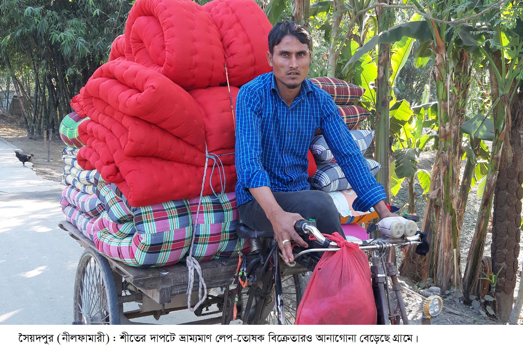 ভ্রাম্যমাণ লেপ–তোষক বিক্রেতা আজাদ হোসেন জানান, তারা ১০ জনের একটি দল সৈয়দপুর শহরে ভাড়া বাসায় থেকে প্রতিদিন গ্রামে গ্রামে লেপ–তোষক বিক্রি করেন। বগুড়ার মোকাম থেকে মহাজনের পাঠানো পণ্য বিক্রি করে যে কমিশন পান, তা দিয়েই সংসার চলে।
