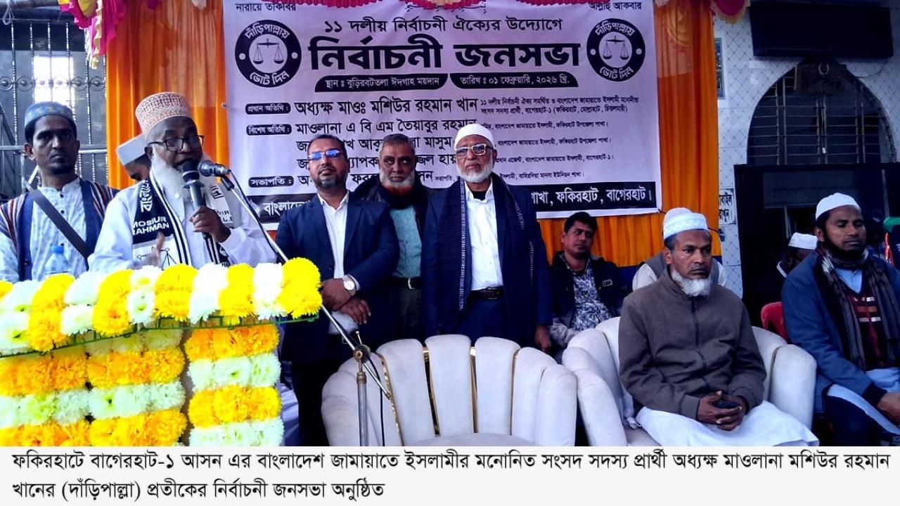 বাগেরহাট-১ আসনের (ফকিরহাট-মোল্লাহাট-চিতলমারী) জামায়াত মনোনীত সংসদ সদস্য প্রার্থী অধ্যক্ষ মাওলানা মশিউর রহমান খানের দাঁড়িপাল্লা প্রতীকের নির্বাচনী জনসভা অনুষ্ঠিত হয়েছে।