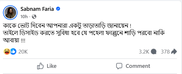 মঙ্গলবার (১০ ফেব্রুয়ারি) রাতে তার ভেরিফায়েড ফেসবুক পেজে দেওয়া স্ট্যাটাসে তিনি ভোট দেওয়ার পাশাপাশি পহেলা ফাল্গুনে শাড়ি না আবায়া পরার প্রশ্ন তুলেছেন, যা মুহূর্তের মধ্যে ভাইরাল হয়ে লাইক, শেয়ার ও মন্তব্যের ঝড়ে পরিণত হয়।