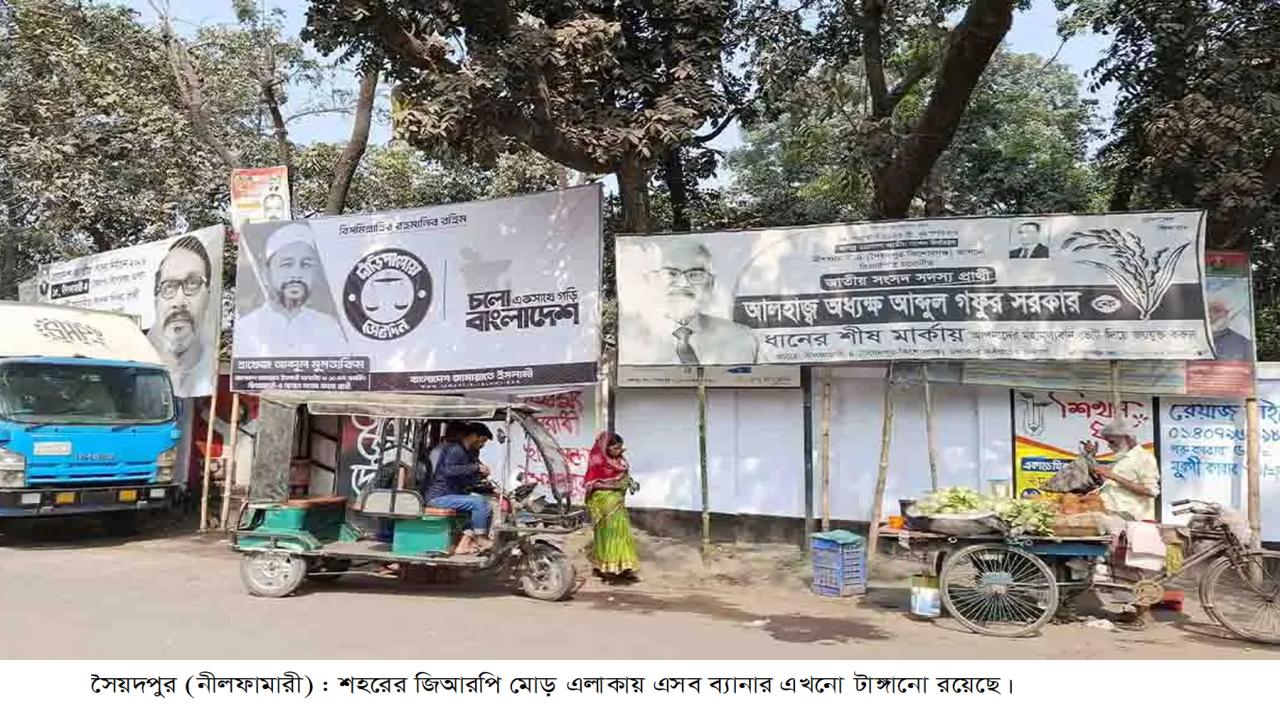 ত্রয়োদশ জাতীয় সংসদ নির্বাচনের পরেও সৈয়দপুর পৌর এলাকায় বিভিন্ন সড়ক, পাড়া-মহল্লা ও গুরুত্বপূর্ণ স্থানে নির্বাচনী পোস্টার, ব্যানার ও ফেস্টুন ঝুলে আছে। অনেক জায়গায় এগুলো ছিঁড়ে রাস্তায় পড়ে বা গাছ ও বিদ্যুতের খুঁটিতে ঝুলে থেকে নগর সৌন্দর্য ও পরিবেশের জন্য ঝুঁকি সৃষ্টি করছে। নির্বাচনী বিধিমালায় স্পষ্ট বলা হয়েছে যে ভোটগ্রহণের ৪৮ ঘন্টার মধ্যে প্রার্থীদের নিজস্ব প্রচারণা সামগ্রী অপসারণ করতে হবে। তবে এখনও প্রার্থীদের পক্ষ থেকে কার্যকর উদ্যোগ দেখা যায়নি। নির্বাচন কমিশন পরিবেশ সুরক্ষার কারণে কাগজের পোস্টার ব্যবহার নিষিদ্ধ করলেও বাস্তবে প্রার্থীরা পিভিসি, রেক্সিন, অপচনশীল কাপড় ও প্লাস্টিকের ব্যানার ব্যবহার করেছেন। সরেজমিনে শহীদ ডা. জিকরুল হক সড়ক, শেরেবাংলা রোড, জিআরপি চত্বর ও ক্যান্টনমেন্ট সড়কসহ বিভিন্ন এলাকায় অনেক ব্যানার এখনও ঝুলে আছে। অনেক জায়গায় খোলা ব্যানার ও ফেস্টুন ফুটপাত ও ড্রেনে পড়ে জলাবদ্ধতা সৃষ্টি করতে পারে। সৈয়দপুরের সেতুবন্ধন যুব উন্নয়ন সংস্থার সভাপতি আলমগীর হোসেন বলেন, “প্লাস্টিক ও অপচনশীল ব্যানারের এই ব্যবহার পরিবেশ ও নগর ব্যবস্থাপনায় দীর্ঘমেয়াদি ক্ষতি করতে পারে। দ্রুত অপসারণ জরুরি।” সৈয়দপুর পৌরসভার নির্বাহী প্রকৌশলী শহিদুল ইসলাম জানান, নির্বাচন শেষে ৪৮ ঘণ্টার মধ্যে প্রার্থীদের অপসারণের নির্দেশনা রয়েছে। পৌরসভার পক্ষ থেকে তখনই কার্যক্রম গ্রহণ করা হবে, যদি কেন্দ্র থেকে আনুষ্ঠানিক নির্দেশনা আসে। উল্লেখ্য নীলফামারী-৪ আসনের নির্বাচনে জামায়াতে ইসলামীর হাফেজ আব্দুল মুনতাকিম জয়লাভ করেছেন। তাঁর নিকটতম প্রতিদ্বন্দ্বী ছিলেন বিএনপির আব্দুল গফুর সরকার ও জাতীয় পার্টির সিদ্দিকুল আলম।