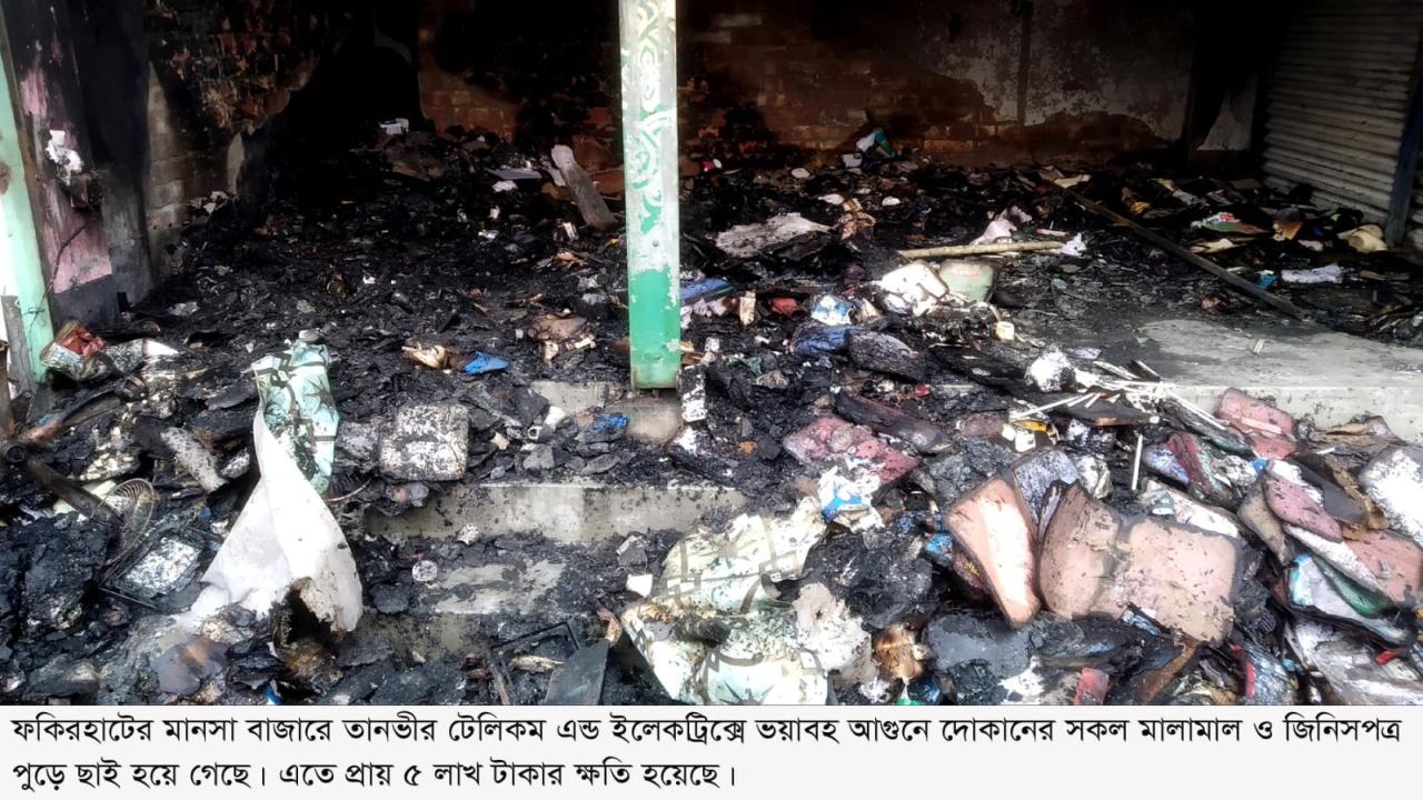 ফকিরহাট উপজেলার মানসা বাজারে তানভীর টেলিকম এন্ড ইলেকট্রিক্স দোকানে ভয়াবহ এক অগ্নিকাণ্ডের ঘটনা ঘটে। এতে নগদ টাকাসহ দোকানের সকল মালামাল ও জিনিসপত্র পুড়ে ছাই হয়ে গেছে।
