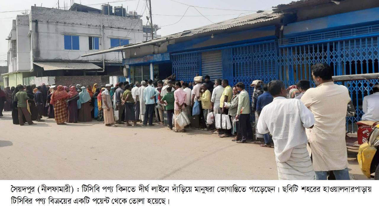 নীলফামারীর সৈয়দপুরে ট্রেডিং করপোরেশন অব বাংলাদেশের (টিসিবি) পণ্য কিনতে বিভিন্ন শ্রেণি-পেশার মানুষ দীর্ঘ সময় লাইনে দাঁড়িয়ে ভোগান্তি পোহাচ্ছেন। শহরের হাওয়ালদারপাড়া এলাকায় টিসিবির পণ্য বিক্রয়ের পয়েন্টগুলোতে দেখা যায় নারী-পুরুষ, বৃদ্ধ ও যুবক সবাই দীর্ঘ লাইনে দাঁড়িয়ে অপেক্ষা করছেন, অনেকেই পণ্য সংগ্রহ করতে না পেরে ফিরে যাচ্ছেন।