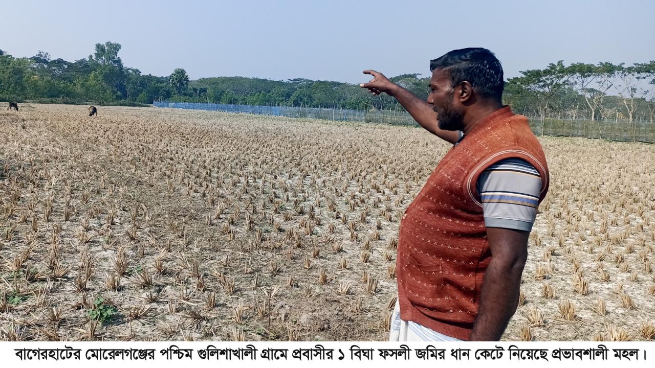 বাগেরহাটের মোরেলগঞ্জে পর্তুগাল প্রবাসী শরিফুল ইসলাম শাওনের পৈত্রিক সম্পত্তির একটি অংশ দখল করে এক বিঘা ফসলি জমির ধান কেটে নেওয়ার অভিযোগ উঠেছে স্থানীয় একটি প্রভাবশালী মহলের বিরুদ্ধে। এ ঘটনায় প্রবাসীর পিতা শাহানুর রহমান শাহিন বাদী হয়ে আটজনের বিরুদ্ধে আদালতে মামলা করেছেন।