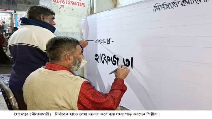 ত্রয়োদশ জাতীয় সংসদ নির্বাচনকে সামনে রেখে নীলফামারীর সৈয়দপুরে আবারও ফিরে এসেছে এক সময়ের পরিচিত দৃশ্য—কাপড়ে হাতে লেখা ব্যানার। ডিজিটাল প্রিন্টের দাপটে হারিয়ে যেতে বসা এই শিল্প নতুন করে প্রাণ ফিরে পাচ্ছে এবারের নির্বাচনী প্রচারণায়। নীলফামারী-৪ (সৈয়দপুর–কিশোরগঞ্জ) আসনে নির্বাচনী প্রচারে ডিজিটাল ব্যানারের পরিবর্তে কাপড়ের হাতে লেখা ব্যানারের ব্যবহার বাড়ায় ব্যস্ত সময় পার করছেন সৈয়দপুরের ঐতিহ্যবাহী আর্ট দোকানগুলোর কারিগররা। বিশেষ করে শহরের শহীদ ডা. জিকরুল রোডে অবস্থিত ‘দাদা আর্ট’-এ এখন কাজের চাপ বেড়েছে কয়েক গুণ। দোকানটির কারিগর ওয়াসিম জানান, এবারের নির্বাচনে বিভিন্ন প্রার্থীর কাছ থেকে হাতে লেখা কাপড়ের ব্যানারের বিপুল অর্ডার পাচ্ছেন তারা। নির্বাচন কমিশনের নির্দেশনায় কাপড়ের ব্যানার ব্যবহারের কারণে এই চাহিদা বেড়েছে বলে তিনি মনে করেন। তিনি বলেন, “অনেক বছর পর আবার কাজের ব্যস্ততা ফিরেছে। দোকানে অতিরিক্ত লোকও রাখতে হয়েছে।” সাদা কাপড়ে ব্যানার লিখতে খরচ পড়ছে প্রায় ৫০০ টাকা, আর কাপড় সরবরাহ করলে মজুরি নেওয়া হচ্ছে ৪০০ টাকা। সাম্প্রতিক কয়েকটি নির্বাচনে ডিজিটাল ব্যানারের আধিক্যে ধুঁকছিল এসব হাতে লেখা আর্টের দোকান। অনেক প্রতিষ্ঠান বন্ধ হওয়ার মুখে পড়লেও এবারের নির্বাচন নতুন করে আশার আলো দেখাচ্ছে শিল্পী ও কারিগরদের। সাংস্কৃতিক কর্মী রইচ উদ্দিন বলেন, হাতে লেখা ব্যানার শুধু প্রচারণার মাধ্যম নয়, এটি আমাদের লোকজ শিল্প ও নান্দনিক ঐতিহ্যের অংশ। পরিবেশবান্ধব এই প্রচারণা পদ্ধতি যেমন দূষণ কমায়, তেমনি স্থানীয় শিল্পীদের সম্মান ও কর্মসংস্থান ফিরিয়ে আনে। এবারের নির্বাচন যেন হারিয়ে যেতে বসা হাতে লেখা ব্যানার শিল্পের পুনর্জাগরণের বার্তা বহন করছে—যা পরিবেশ, সংস্কৃতি ও শিল্পীদের জীবনে স্বস্তি ফিরিয়ে আনছে।